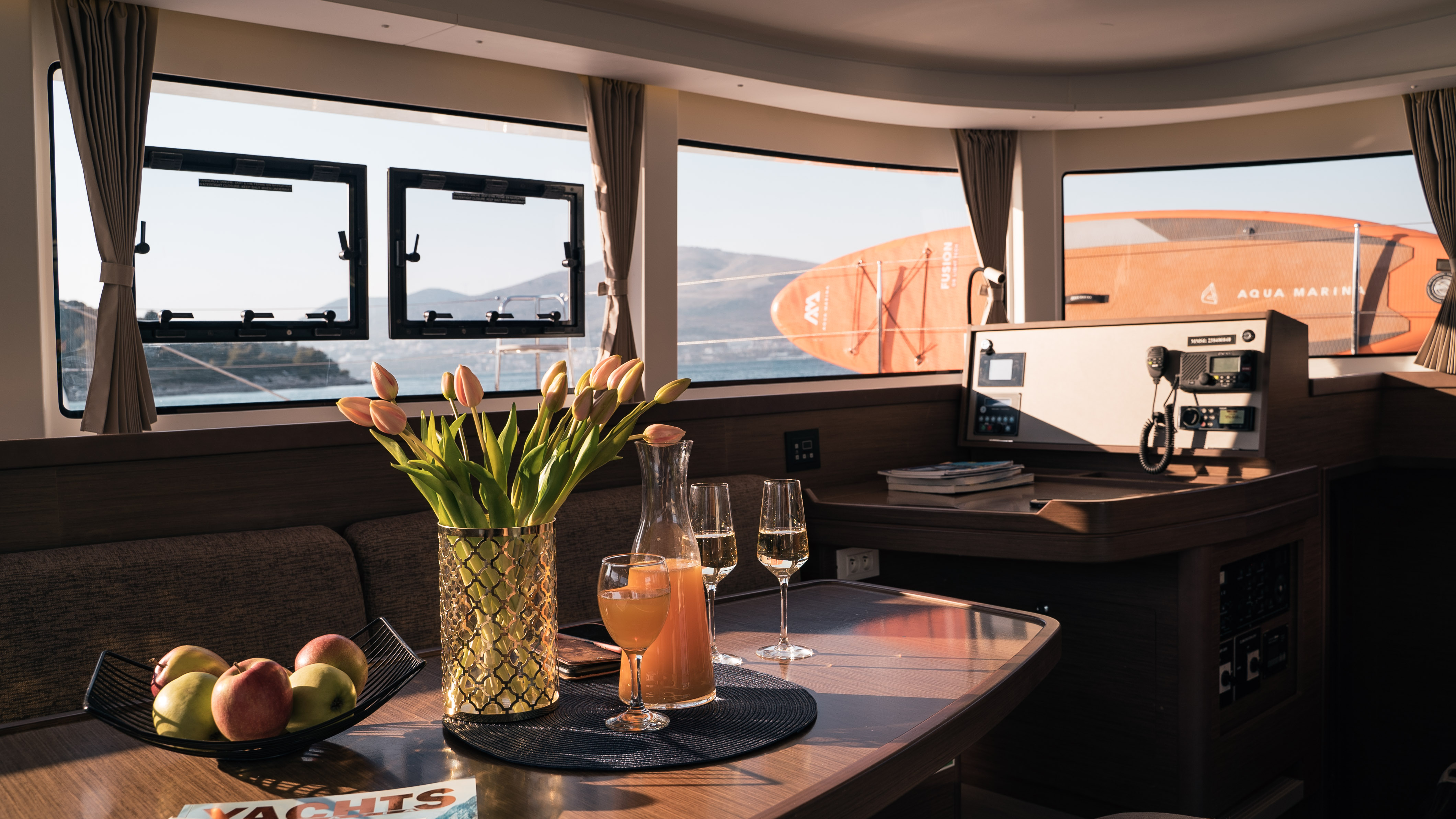 The bright and modern interior offers a comfortable living space with air-conditioning in the saloon and all guest cabins. Guests can enjoy onboard Wi-Fi, a sound entertainment system with Bluetooth, TV, ice maker, and a Nespresso coffee machine – perfect for relaxing evenings or slow mornings at sea.