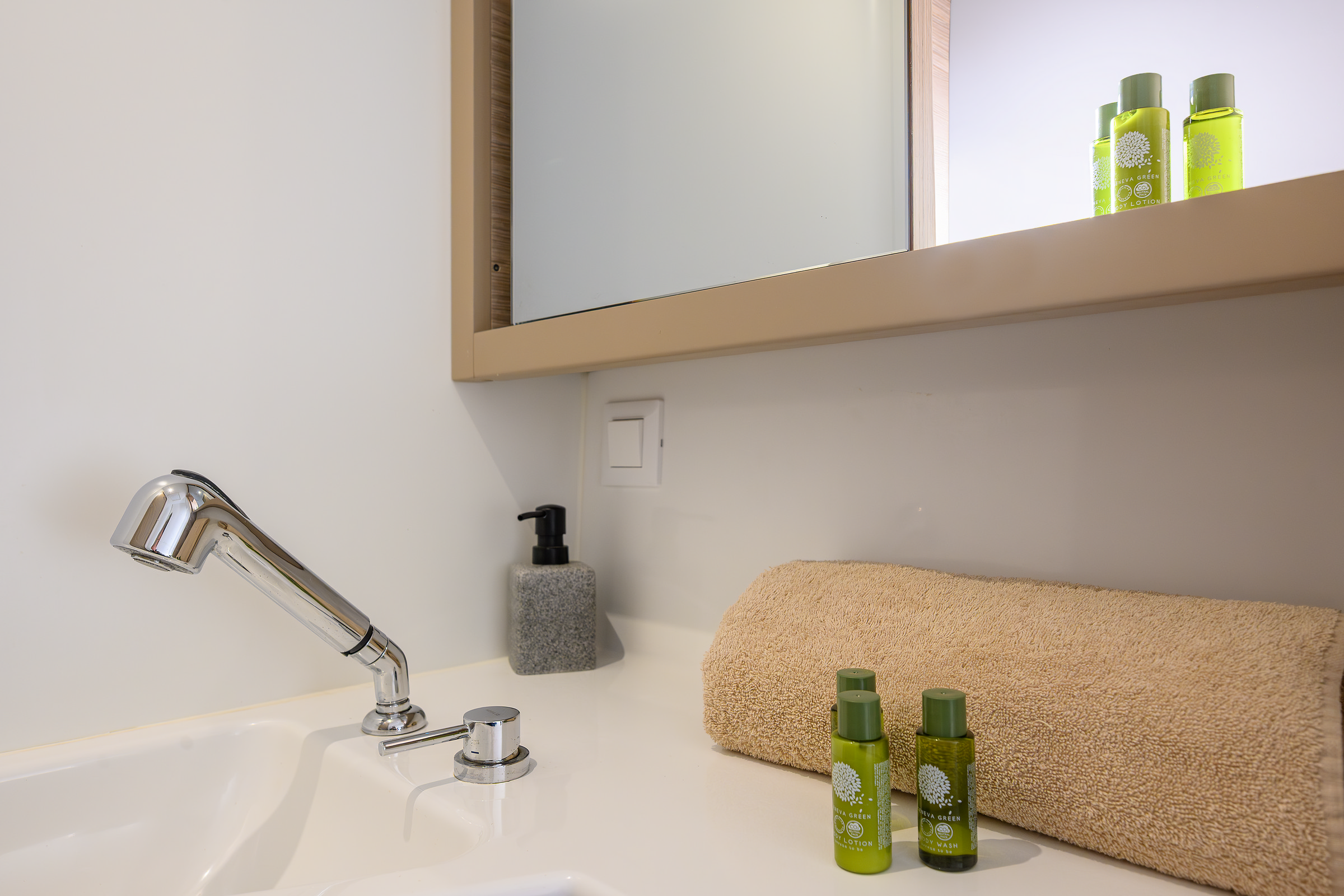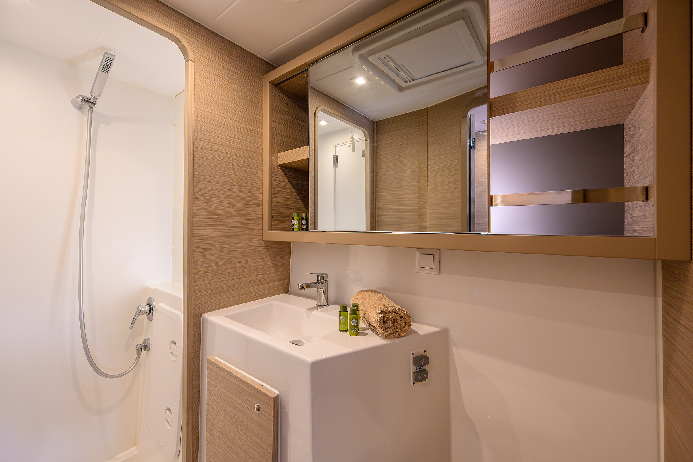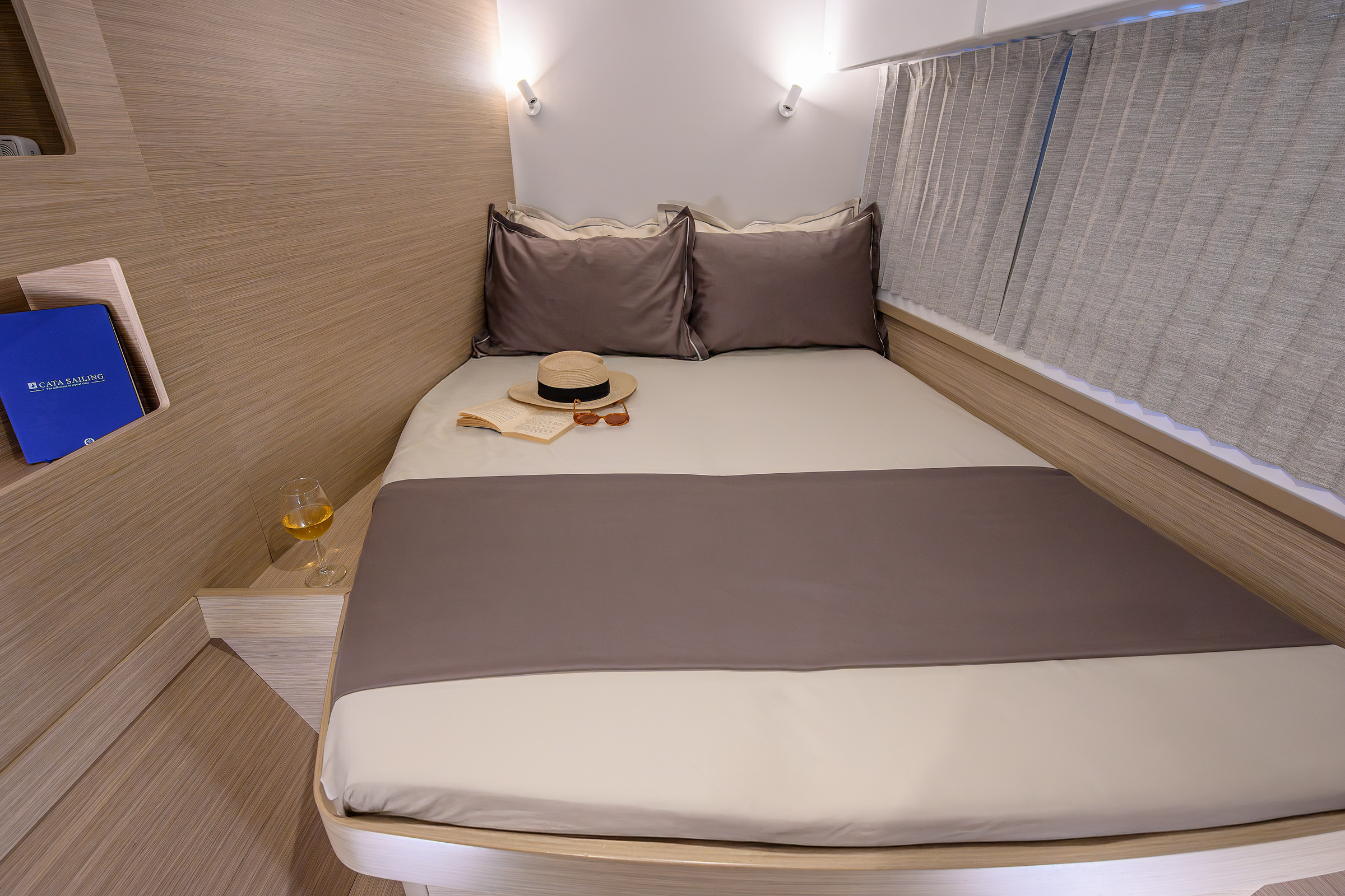 The bright and modern interior offers a comfortable living space with air-conditioning in the saloon and all guest cabins. Guests can enjoy onboard Wi-Fi, a sound entertainment system with Bluetooth, TV, ice maker, and a Nespresso coffee machine – perfect for relaxing evenings or slow mornings at sea.