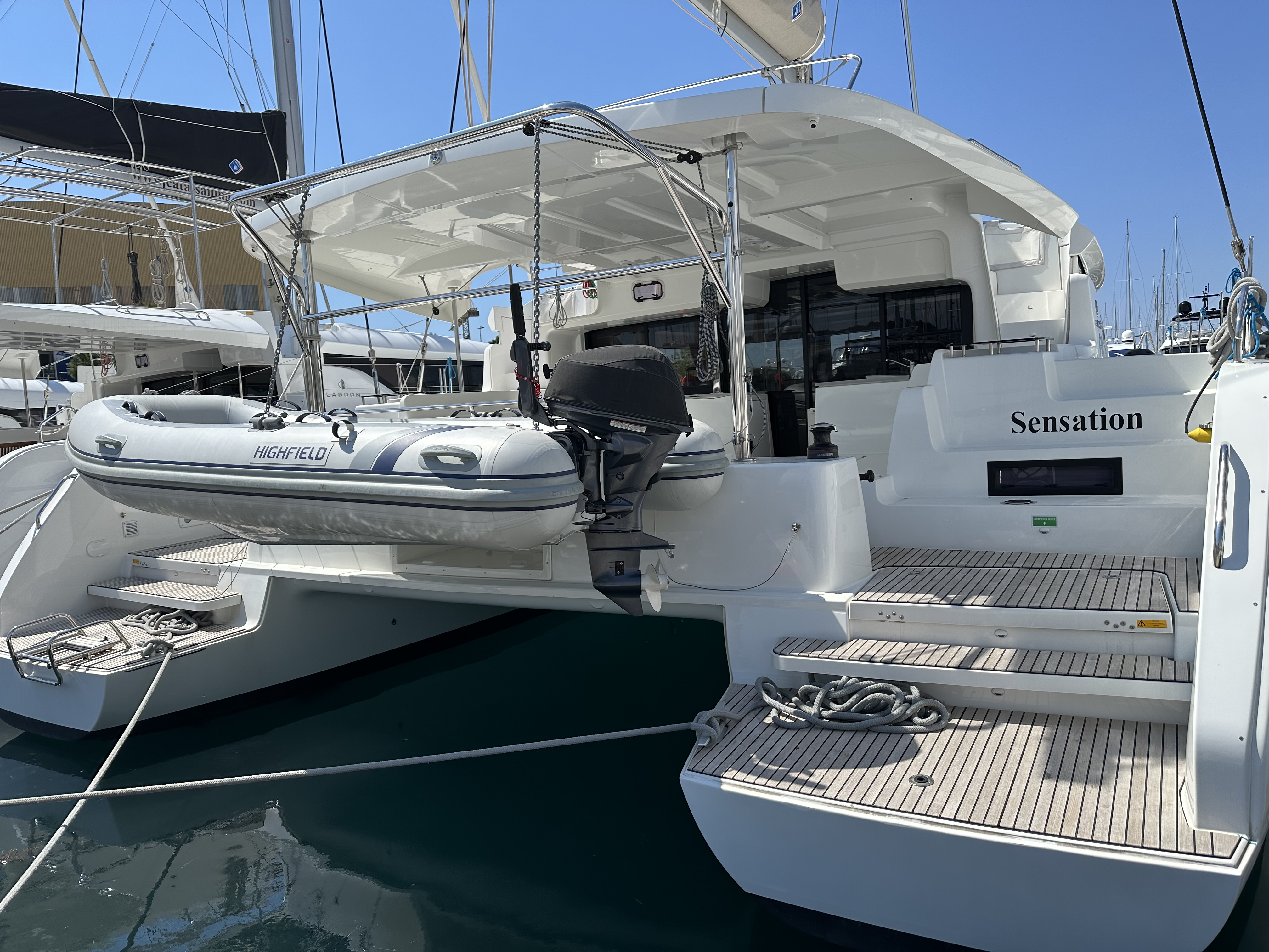 Inside, Sensation offers a refined and elegant atmosphere, with bright, open spaces, wide hulls for maximum comfort, and a seamless connection between the interior and exterior through a large forward sash window and direct access to the front cockpit. The yacht is fully equipped for independent cruising, featuring a generator, air conditioning in all cabins and the saloon, and a water maker that provides a constant supply of fresh water—allowing you to spend more time in beautiful anchorages and less time relying on marinas. Guests can also enjoy a 20 hp tender, unlimited Wi-Fi, and a selection of water toys including SUP and kayak (other water toys available on request).